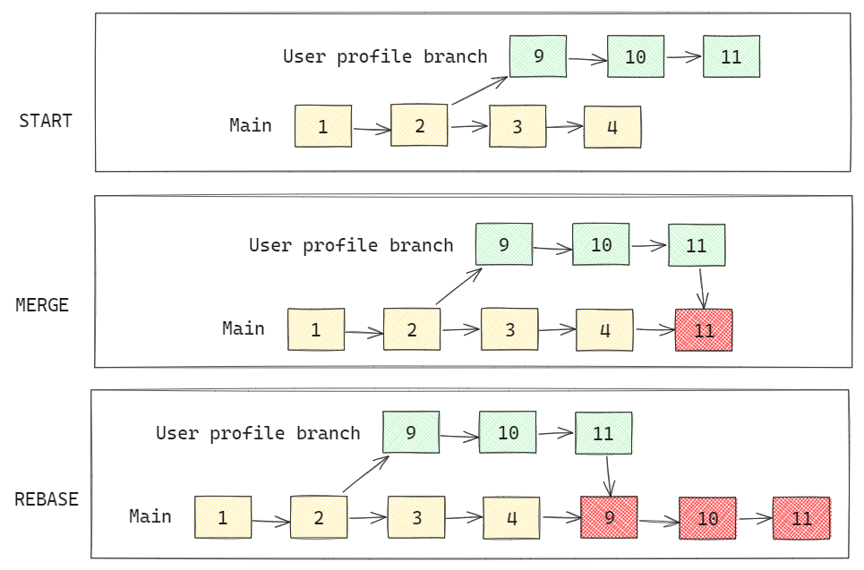 Still, the difference is that the rebase will rewrite the branch history. On the other hand, merging will keep the history of both branches and create a new merge commit. Here is the visual: