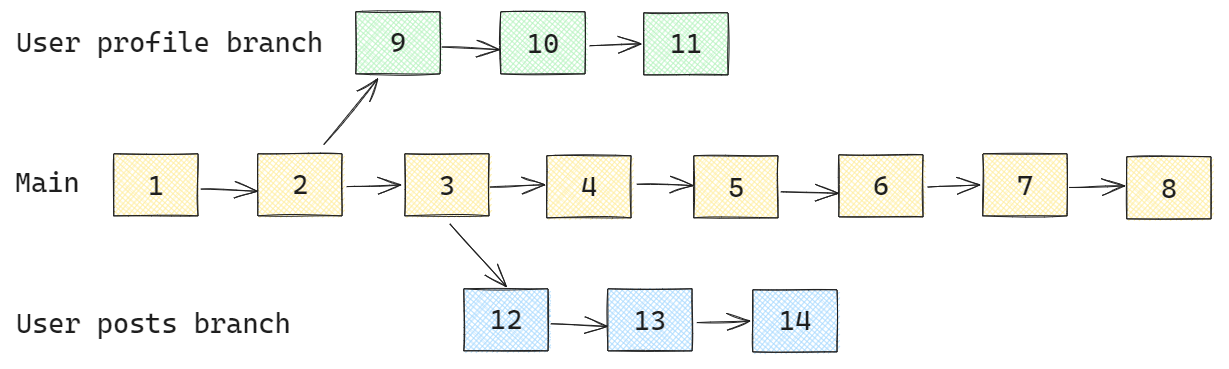 Here you have predefined long-living branches that are used for specific types of tasks or environments. For example, you have branches like main, development, UAT, staging, release, hotfix, etc.
