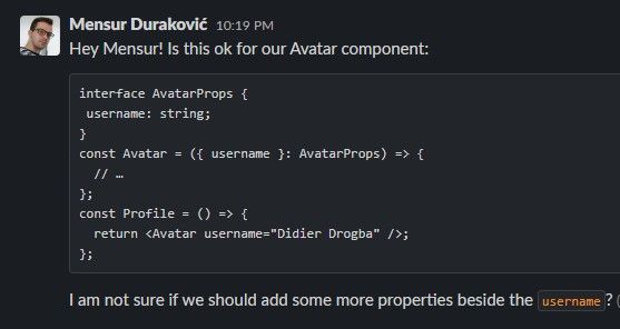 If you are sending code snippets in a message or mentioning some specific programming keywords you can mark it with “code block” or “code” formatting to make messages easier to understand. Here is an example: